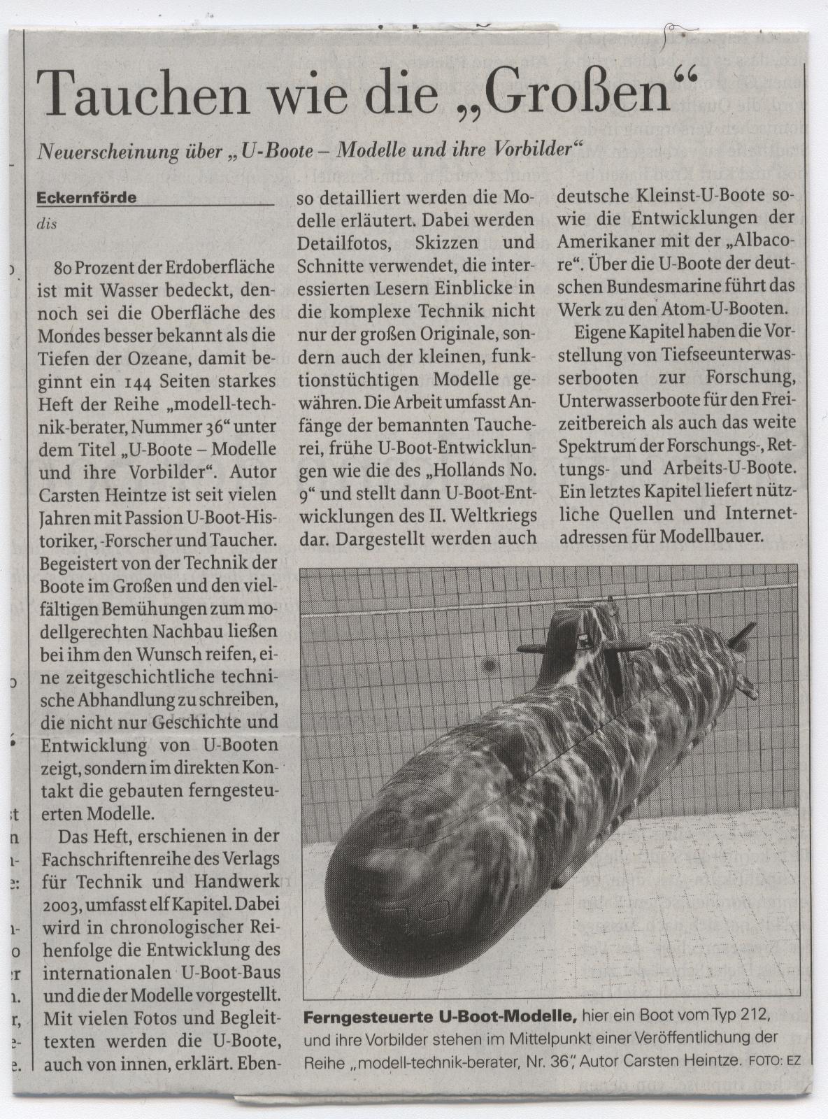Zeitungsbericht der Eckernförder Nachrichten, nach dem Schaufahren des SONAR e.V in der Taucherübungshalle im Juli 2003